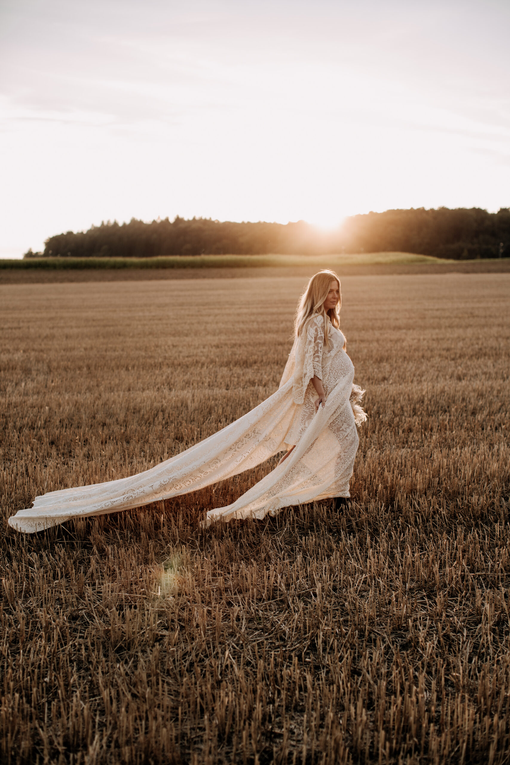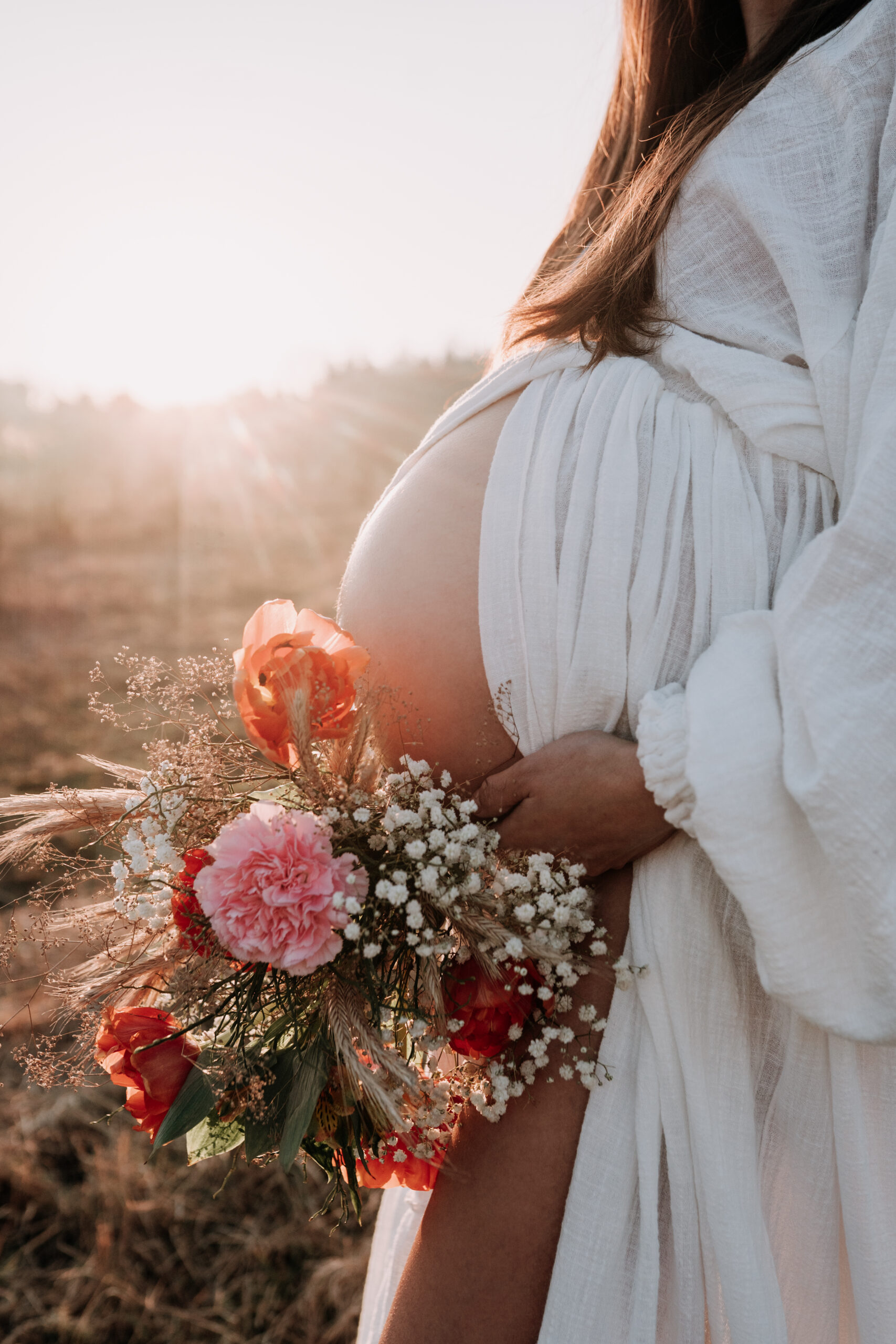Für dein Babybauchshooting in München steht dir eine sorgfältig ausgewählte Kollektion hochwertiger Umstandskleider zur Verfügung, einige davon sind handgefertigte Designerstücke. Von schlichten, fließenden Stoffkleidern über romantischen Boho-Spitzenkleider bis hin zu eleganten, weich fallenden Schwangerschaftskleidern findest du Modelle, die deine Figur wunderschön betonen und sich harmonisch in die Naturkulisse einfügen.